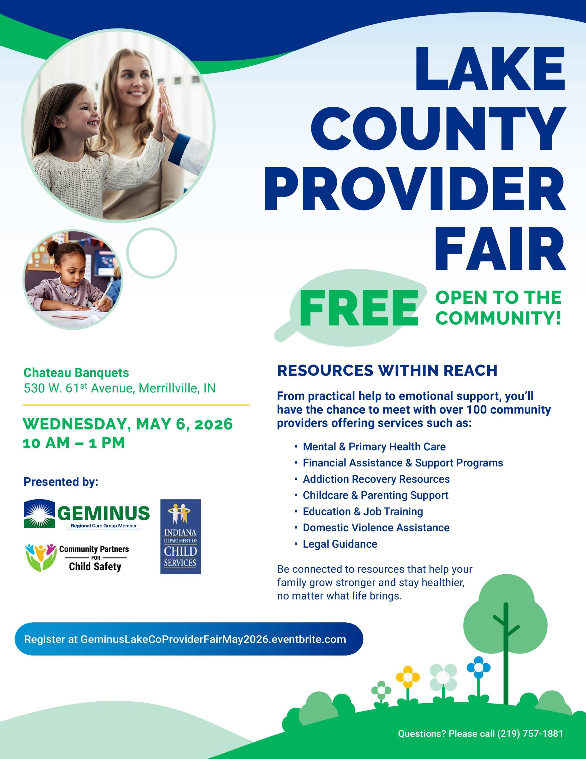 Geminus Lake County Provider Fair is free and open to the community. Be connected to resources that help your family grow stronger and stay healthier, no matter what life brings.